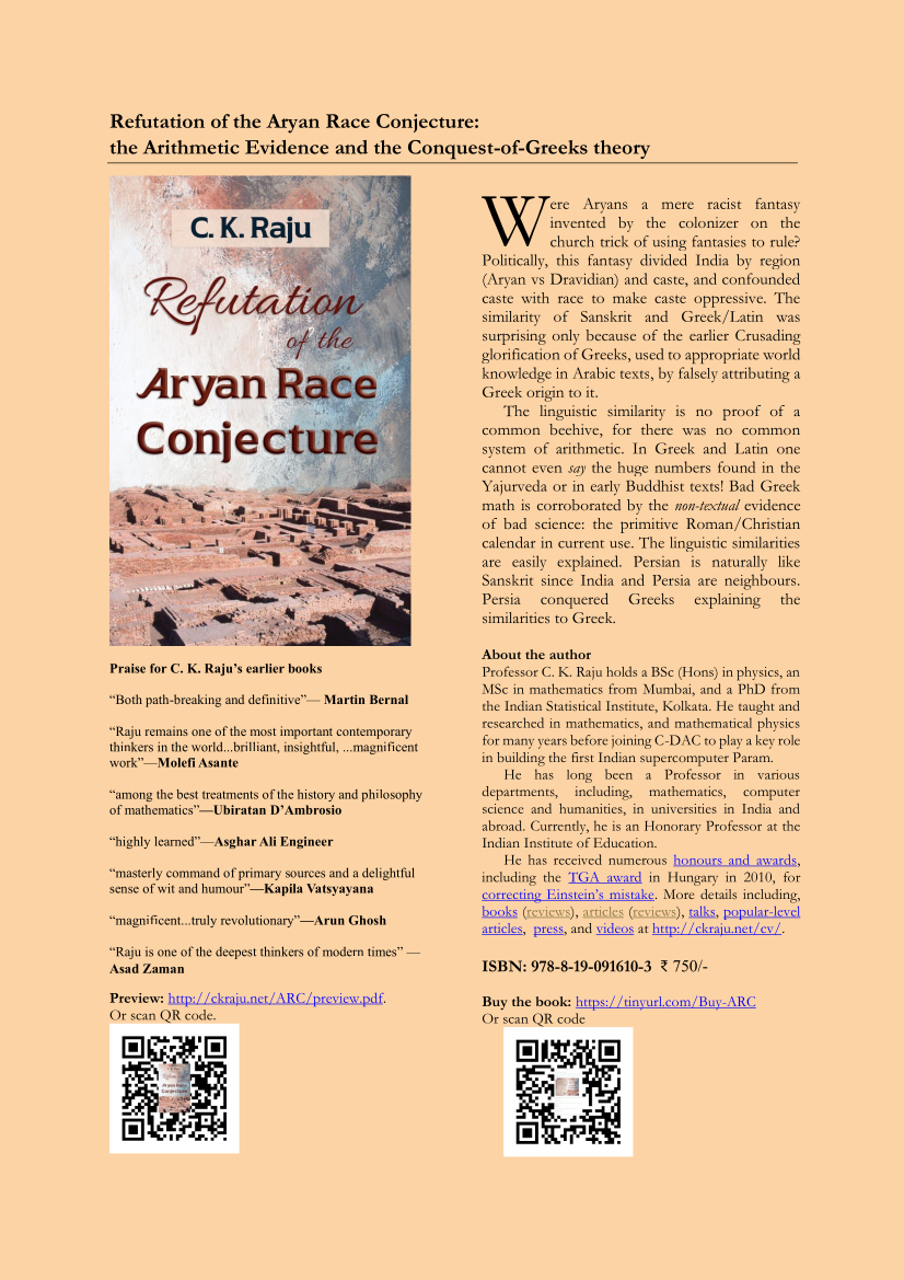 From the backpageWere Aryans a mere racist fantasy invented by the colonizer on the church trick of using fantasies to rule? Politically, this fantasy divided India by region (Aryan vs Dravidian) and caste, and confounded caste with race to make caste oppressive.